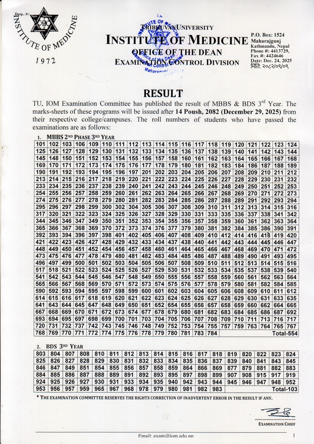 | 2025-12-24 | Result of MBBS 2nd Phase 3rd Year and BDS 3rd Year Regular Exam 2082 | Result of MBBS 2nd Phase 3rd Year and BDS 3rd Year Regular Exam 2082 |