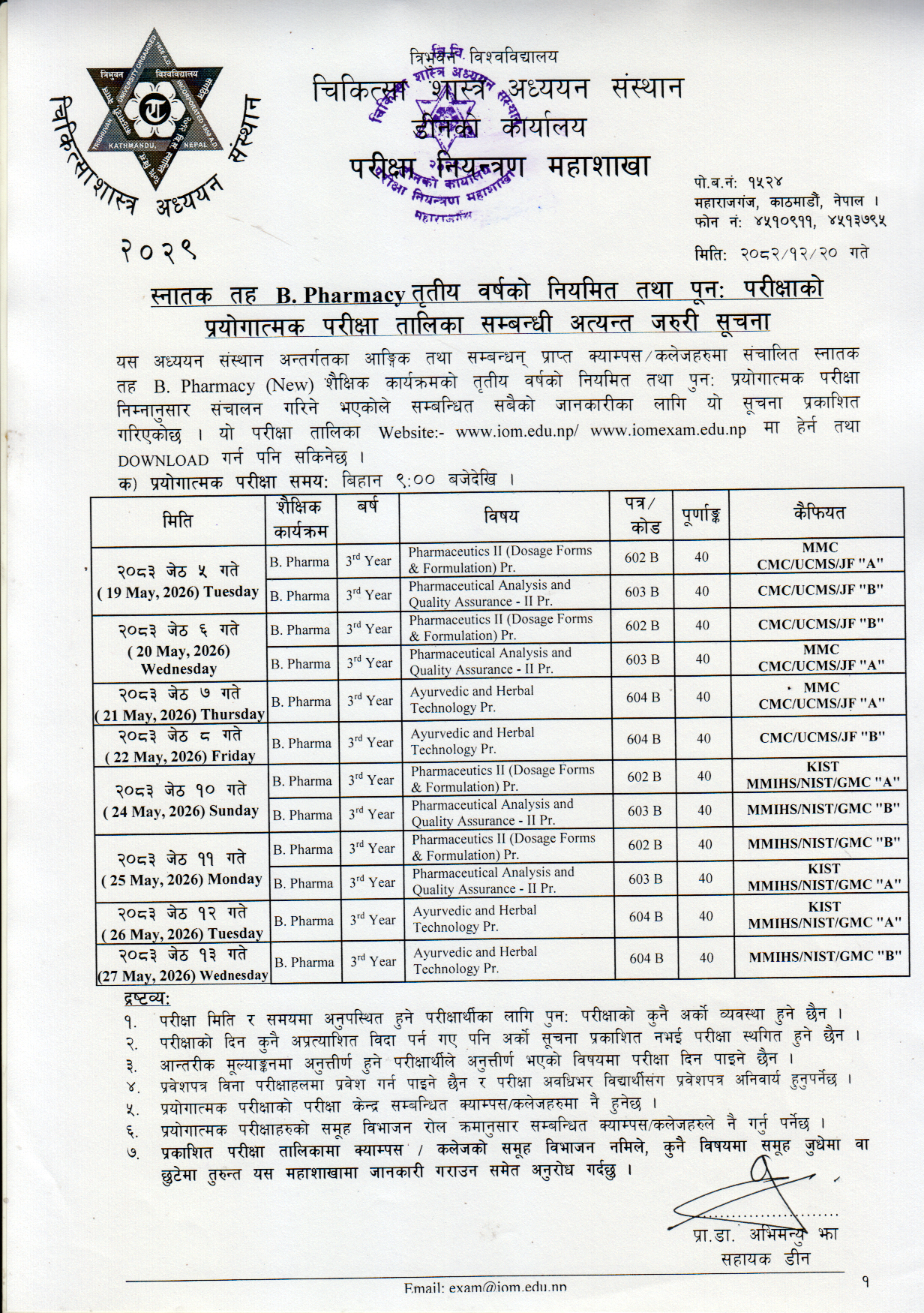 Practical Routine of the B.Pharmacy 3rd Year Regular and Supplementary Exam 2083