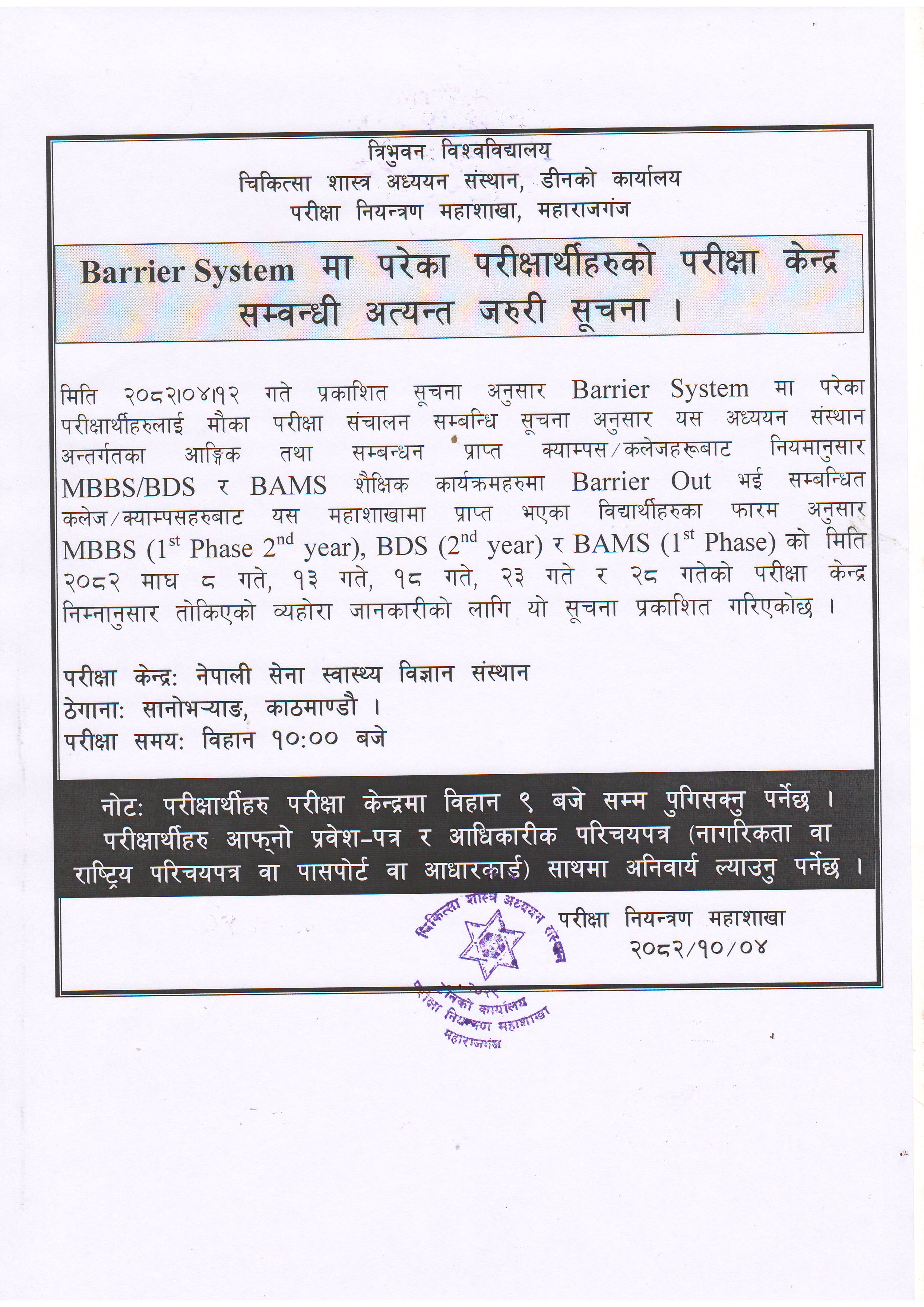 Exam Center Notice for MBBS & BDS 2nd Year & BAMS 1st Phase Chance Examination 2082