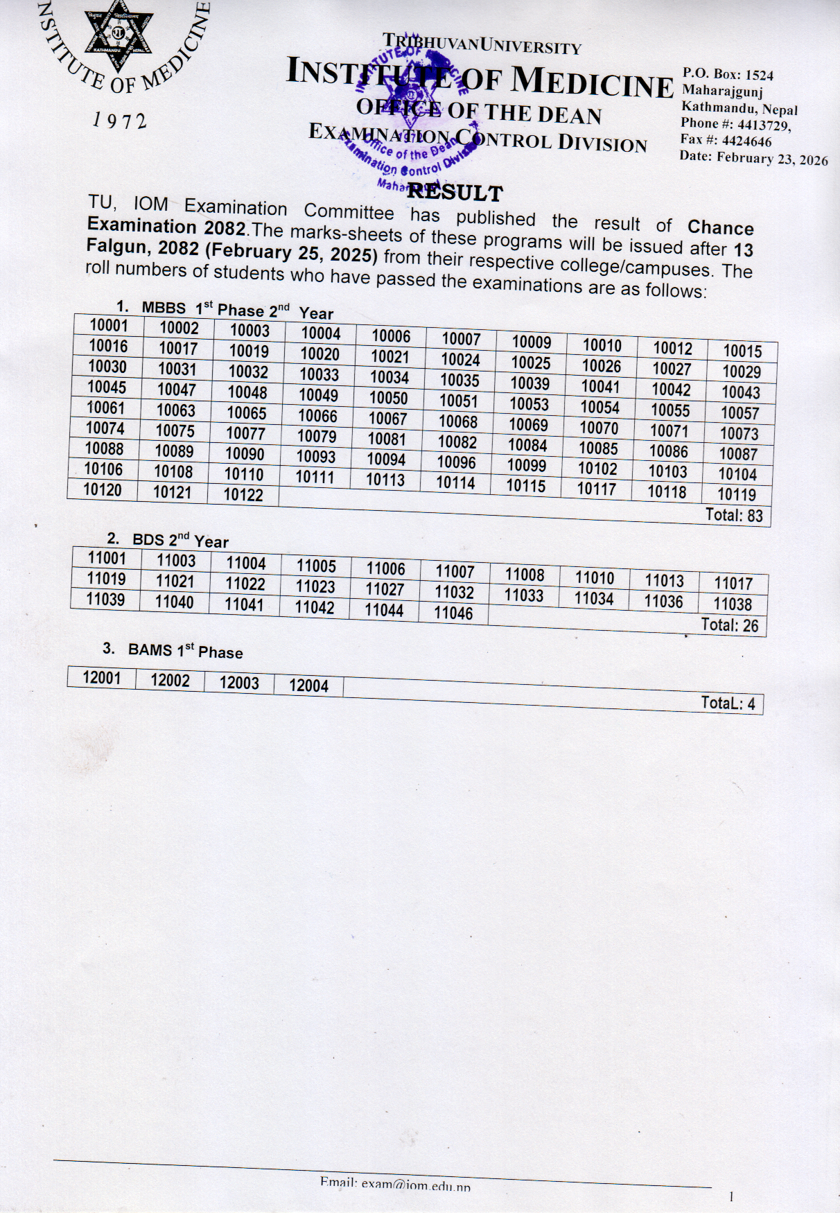 Result of MBBS, BDS 1st phase 2nd Year and BAMS 1st Phase chance Exam 2082