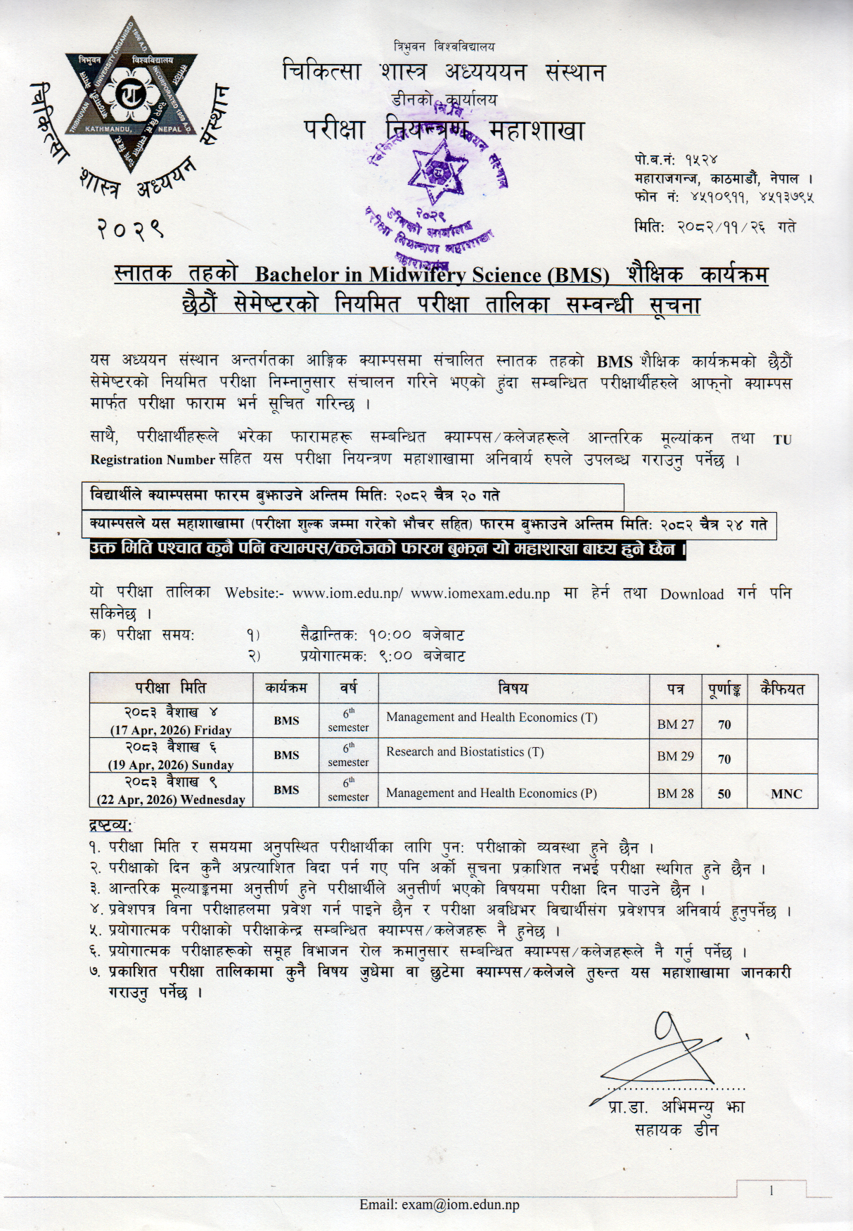 Routine of the Bachelor in Midwifery Science (BMS) 6th semester Regular Exam 2083