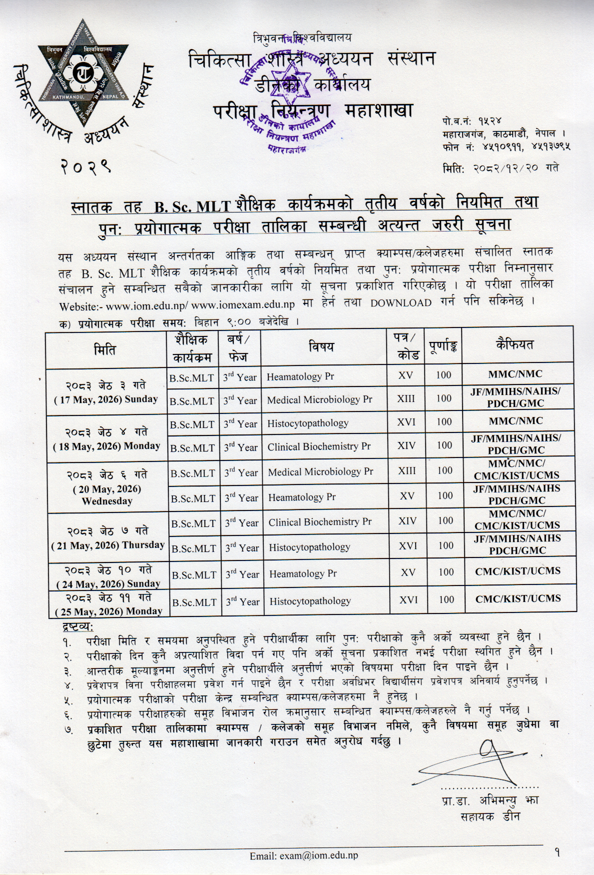 Practical Routine of the B.Sc.MLT 3rd Year Regular and Supplementary Exam 2083