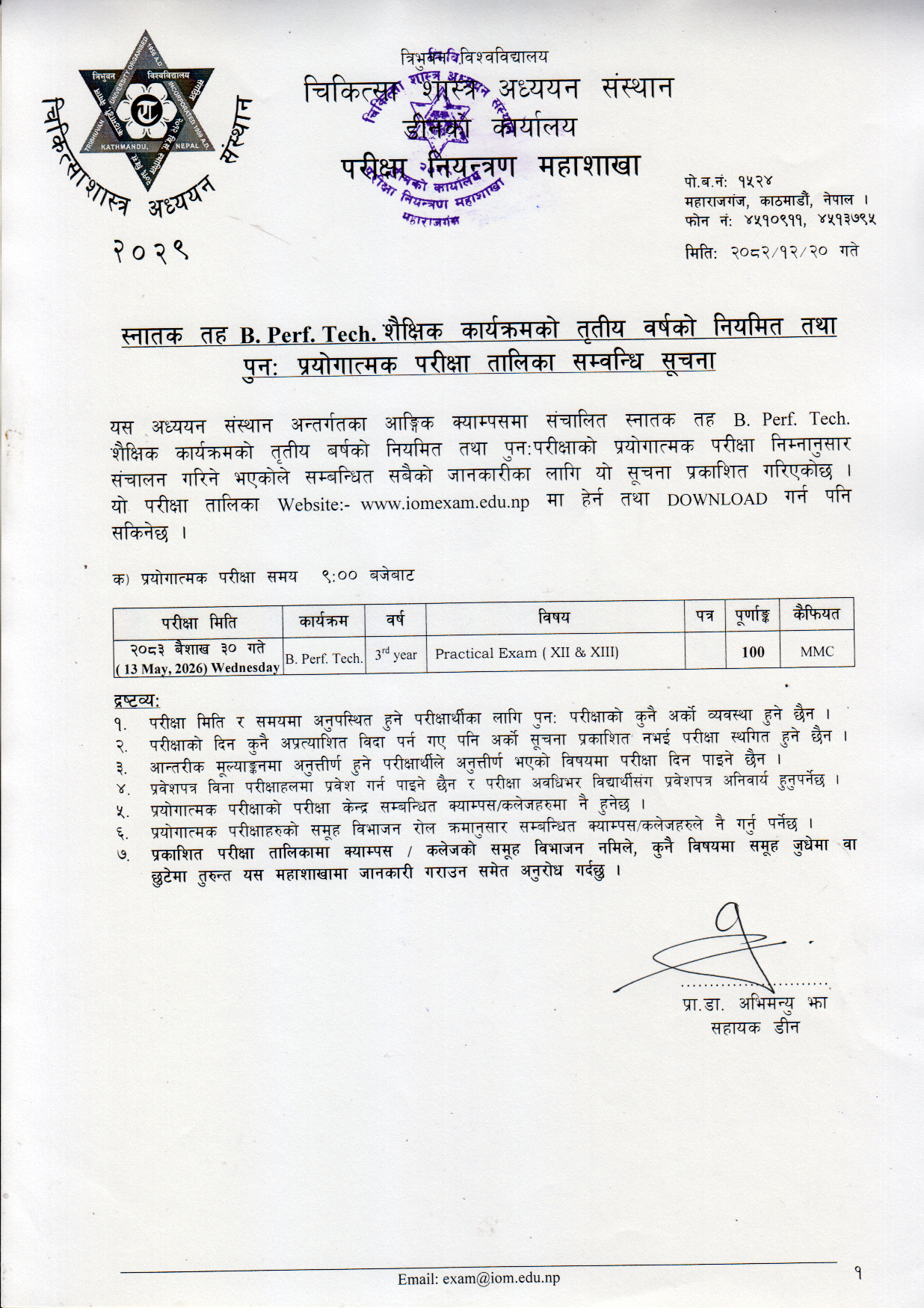 Practical Routine of the B. Perf. Technology 3rd Year Regular and Supplementary Exam 2083